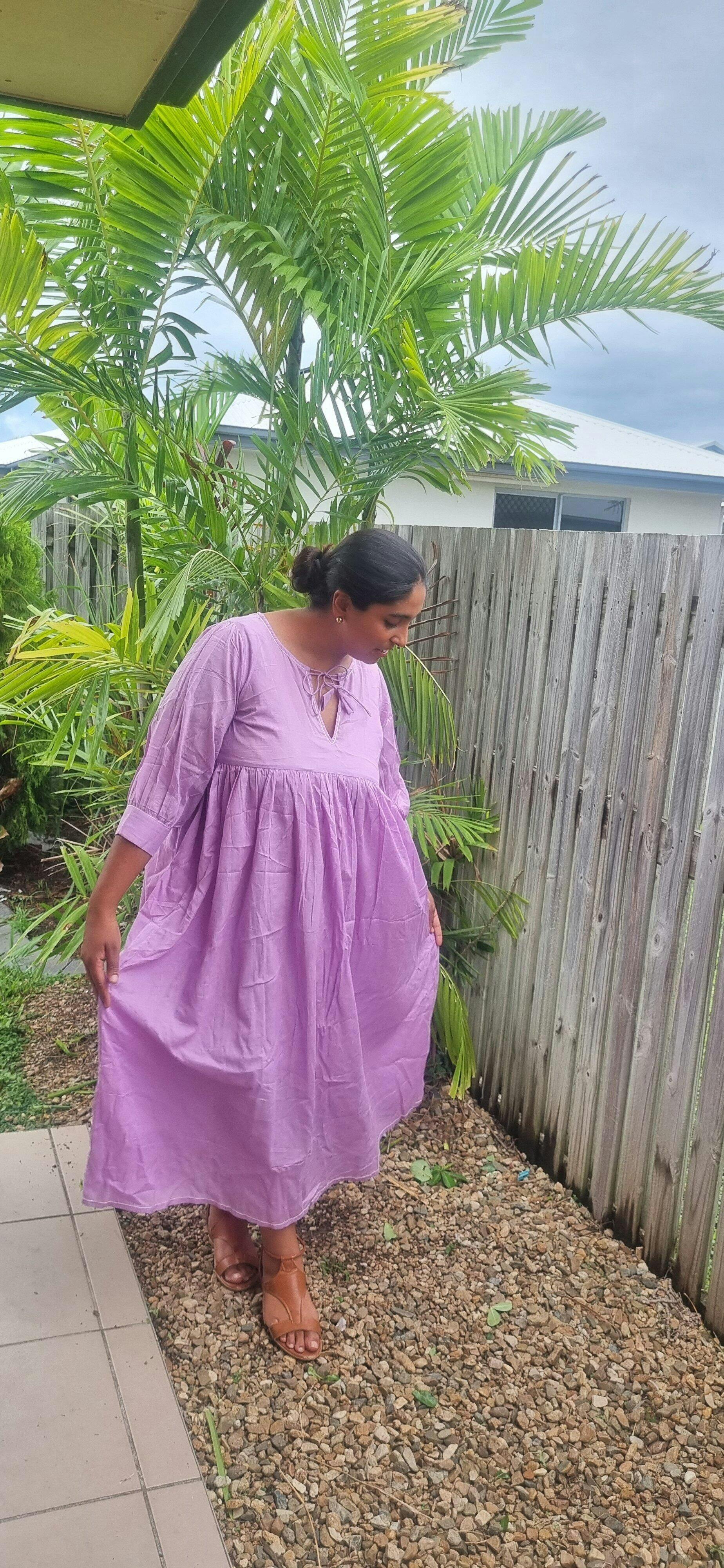 This piece is made with mulmul cotton— soft as breath and light as intention. The lavender shade is naturally dyed and inspired by twilight thoughts, and the dress is stitched by artisans whose quiet work speaks volumes. Each thread feels like verse written slowly, by hand.