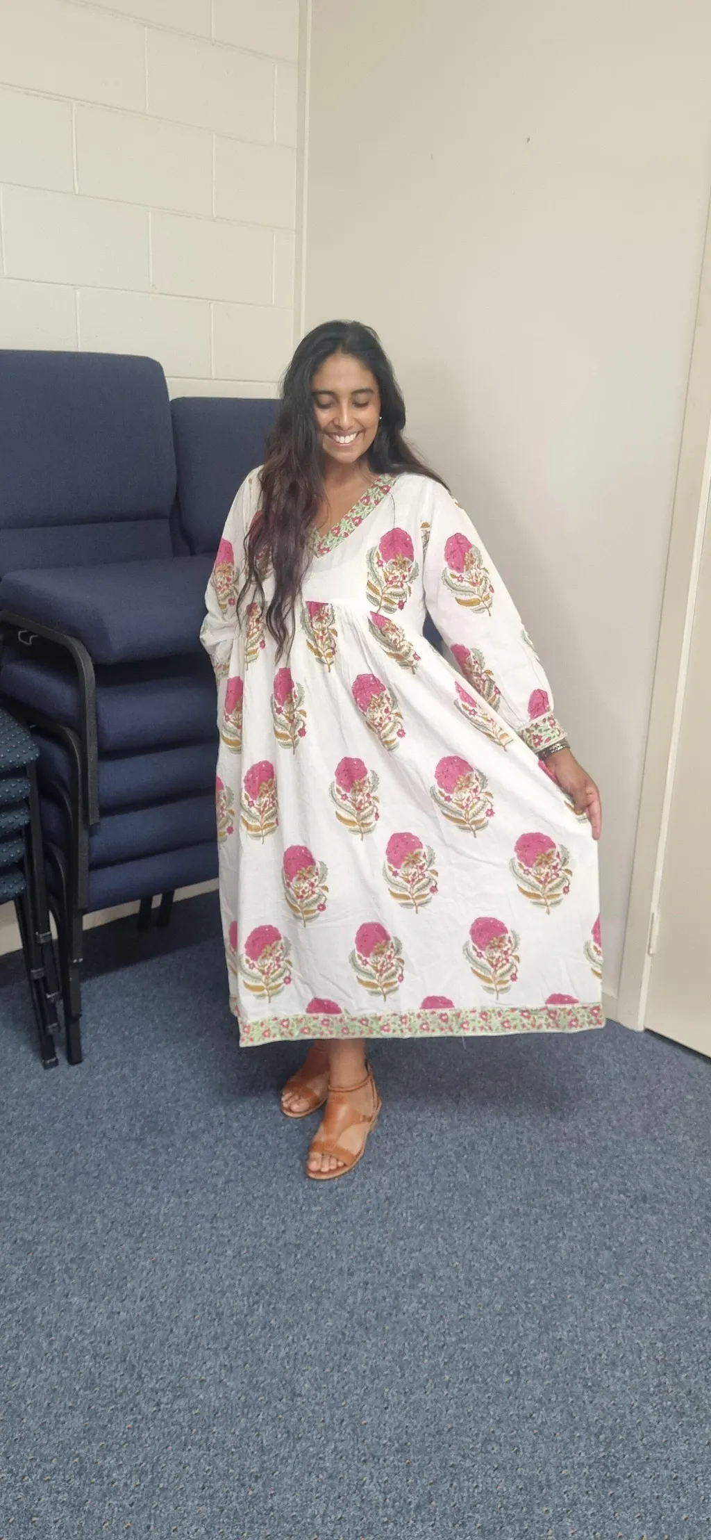 dress is hand block printed and unlined for airflow. It features a V-neckline with intricate border detailing, three-quarter sleeves, and pockets on each side. Designed in Jaipur, its soft gathers and bold lotus motifs offer both elegance and ease.