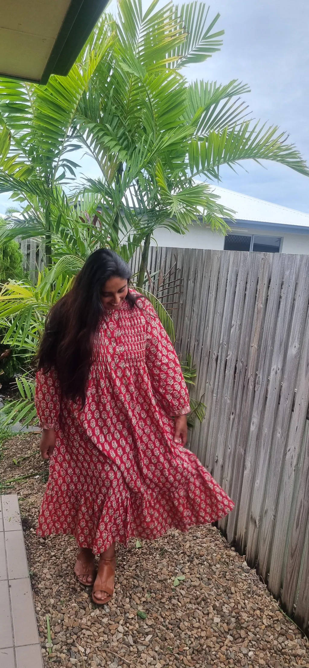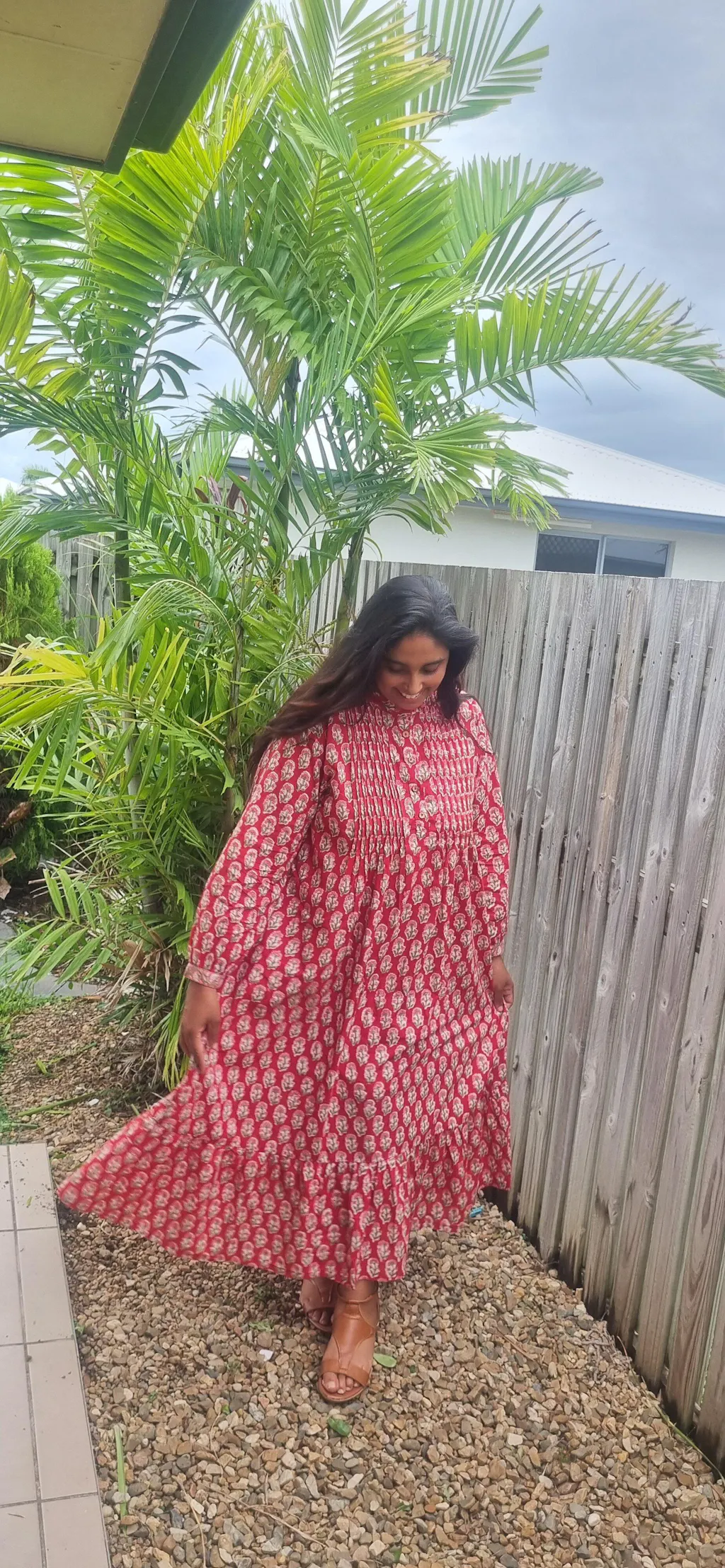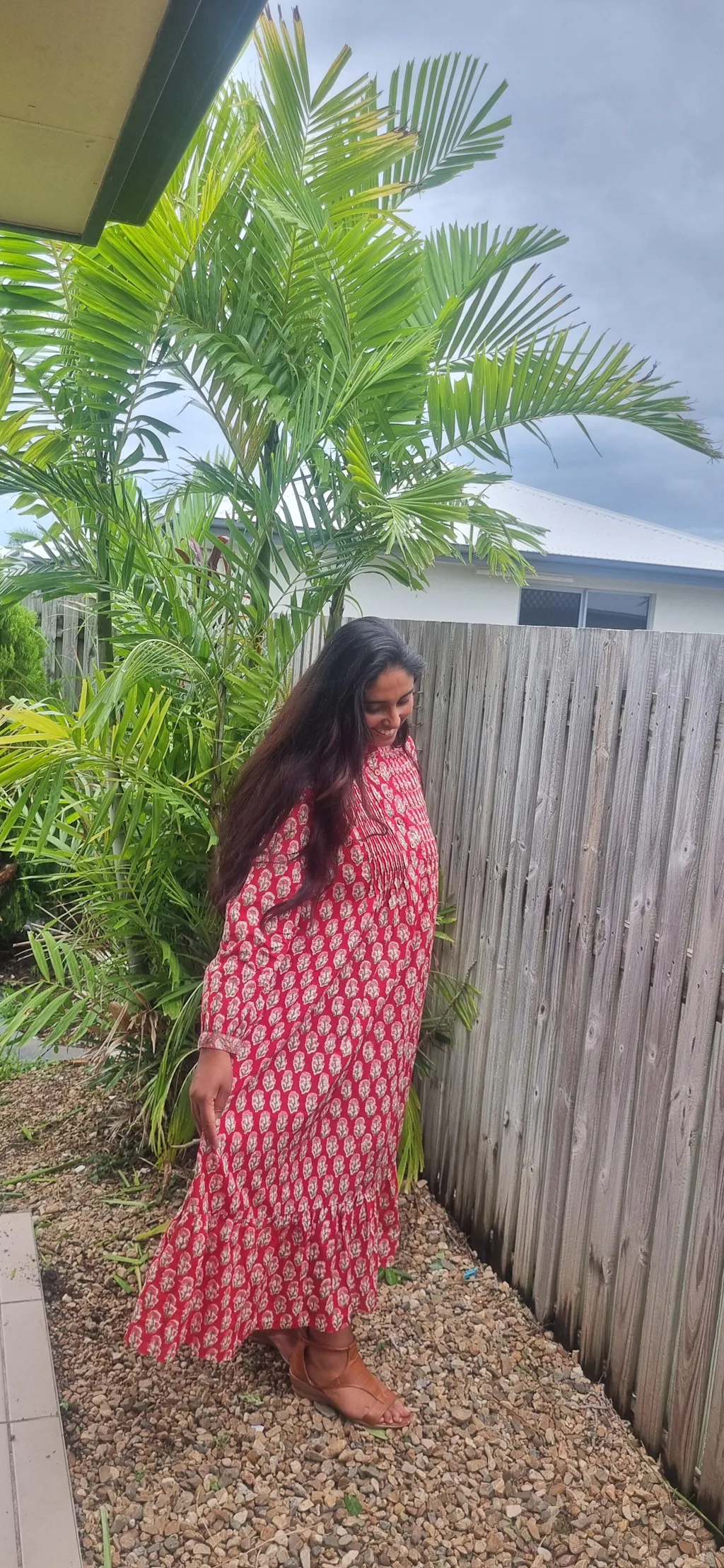 Sunset Muse Red Cotton Maxi Dress - Hand Block Printed